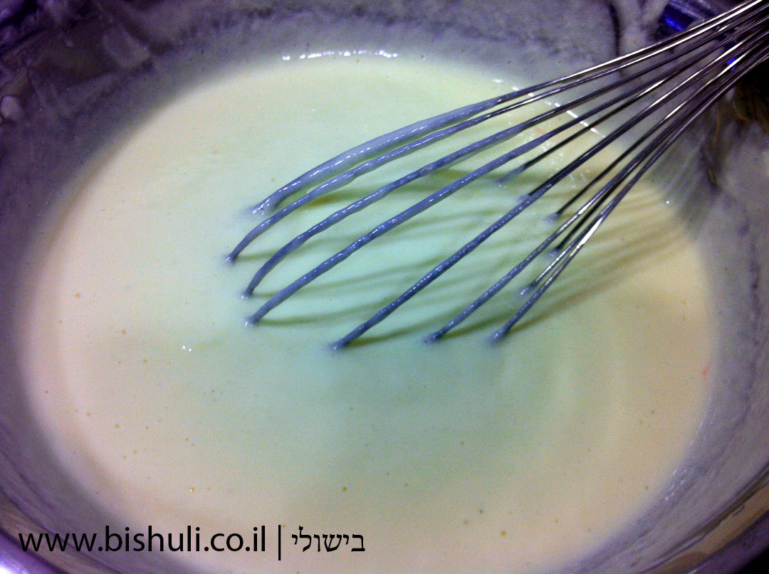 - בינתיים התחילו להכין את מלית הגבינה, בקערה גדולה הניחו ביצים, סוכר, תמצית וניל, קורנפלור וגבינה וערבבו עד לתערובת חלקה ללא גושים והניחו בצד.