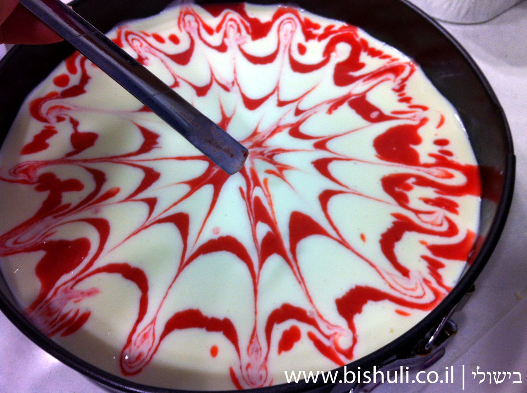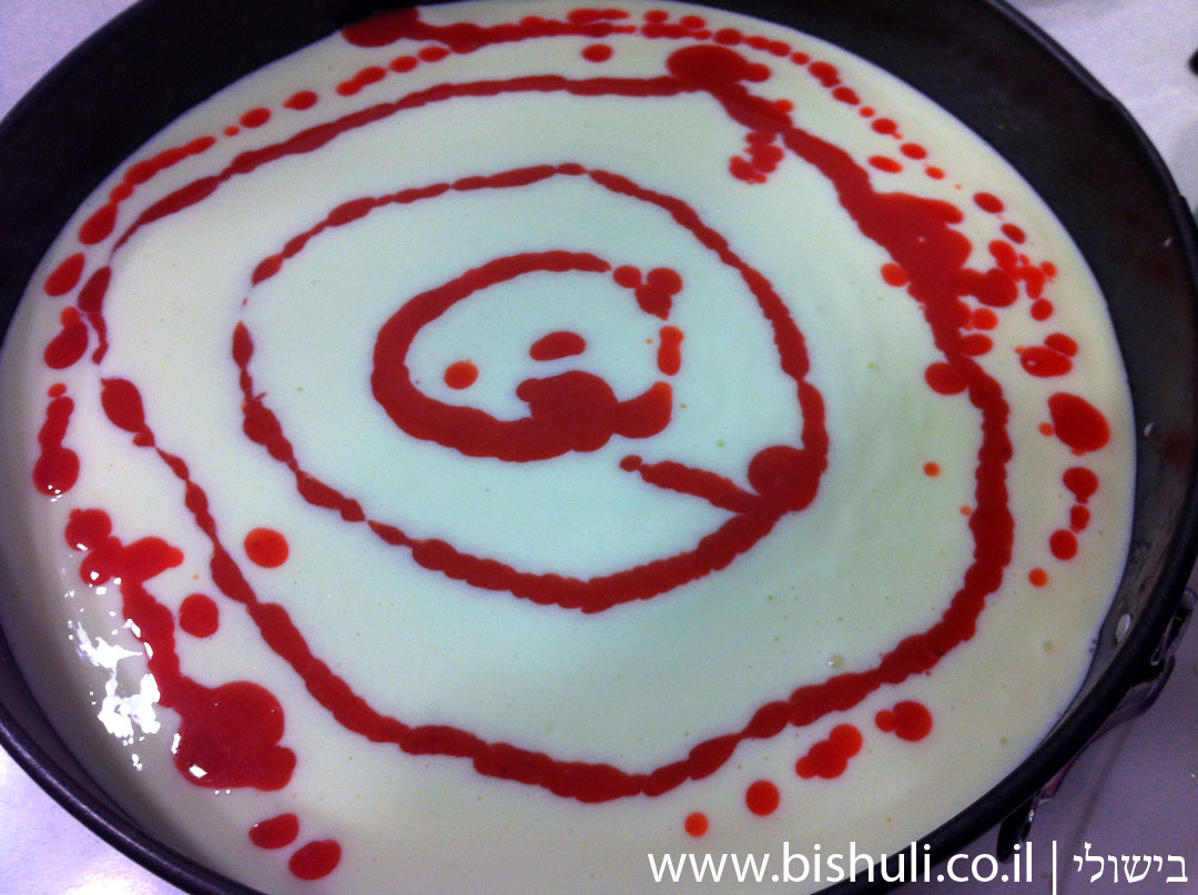 - צקו את מחית התותים מעל הגבינה בצורה של 4 מעגלים (ראו תמונה).