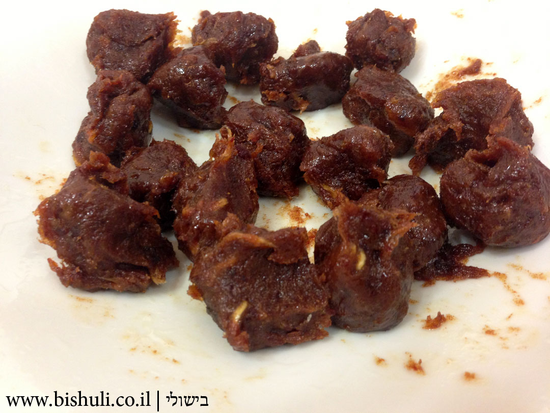 - מחלקים את התמרים ל- 18-20 כדורים שווים ומניחים בצד.