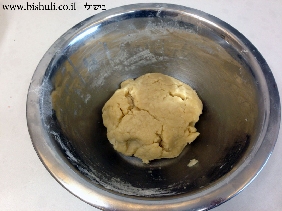 - מנפים את החומרים היבשים לתוך קערה גדולה ויוצרים גומה במרכז, יוצקים את תערובת המרגרינה לתוך הגומה ומתחילים ללוש בעזרת הידיים רק עד לקבלת בצק רך ואחיד. (לא ללוש יותר מידי).