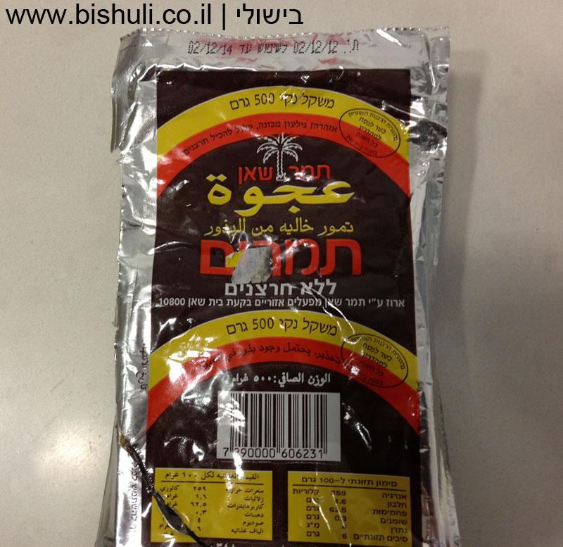- ¼ חבילת תמרים ללא חרצנים ארוזים באריזת וואקום- אפשר למצוא בכל סופר (ניתן להחליף ב- 125 גרם מחית תמרים אך כדאי להשקיע מאמץ קטן ולקנות תמרים מגולענים באריזה, ראו תמונה)