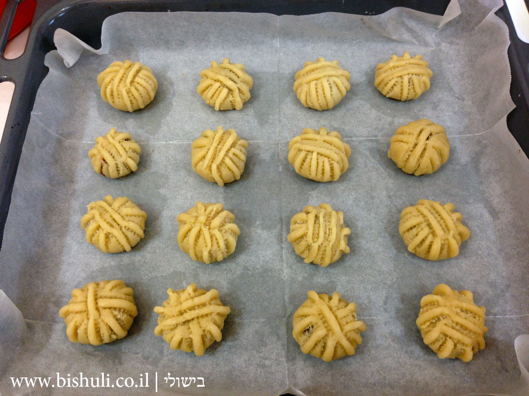 - לאחר שמסיימים להכין את הכדורים מניחים בתבנית תנור מרופדת בנייר אפייה.