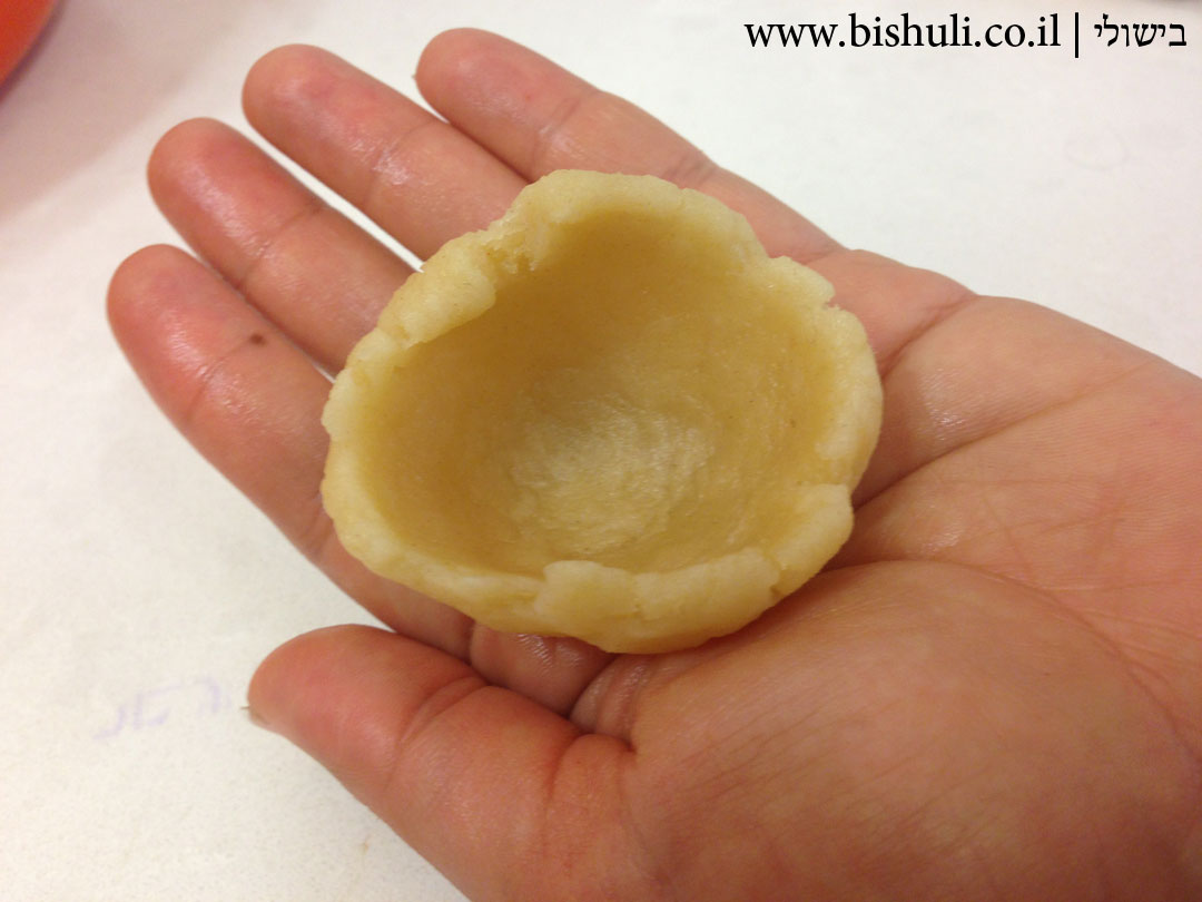 - לוקחים כדור בצק ומניחים אותו בכף היד, בעזרת האצבעות ביד השנייה יוצרים צורה של כמו קערה קטנה (ראו תמונה).