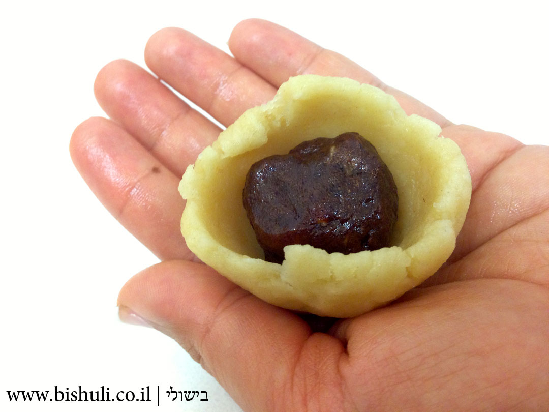 - מכניסים לתוך "קערת הבצק הקטנה" כדור תמרים קטן וסוגרים את הקצוות, מקפידים לצבוט היטב את הקצה כדי שלא יפתח.