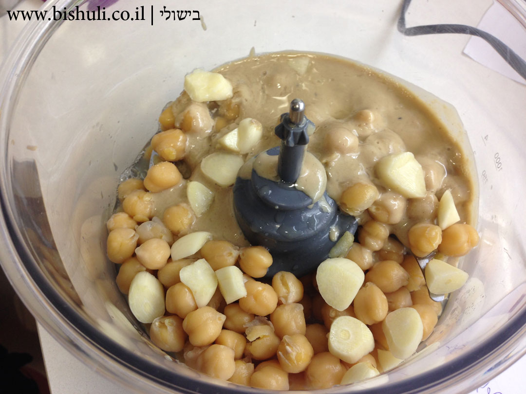 3. טועמים ומתקנים תיבול, במידה והחומוס יבש מידי ניתן להוסיף מים כדי לדלל אותו מעט.