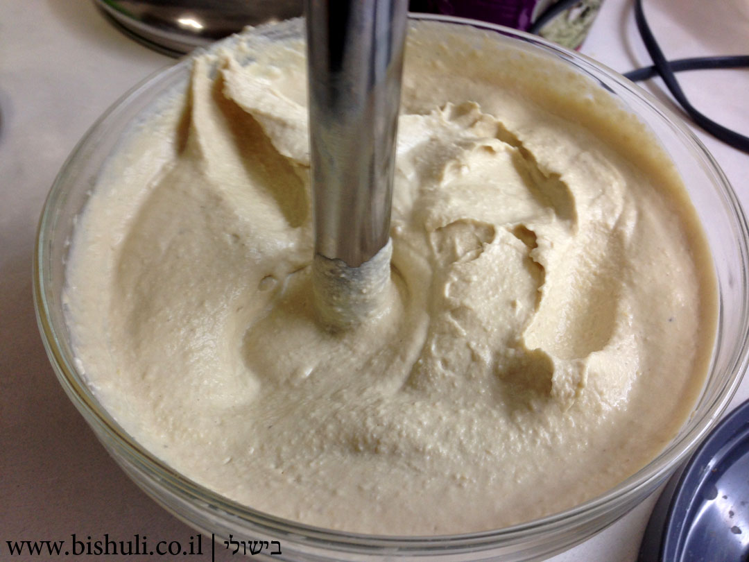 4. כדי להגיע לחומוס טעים במיוחד כדאי להעביר אותו לאחר הטחינה לקערה גדולה ולהמשיך לטחון בעזרת בלנדר מוט עד שמגיעים למרקם חלק יותר. (מומלץ ביותר).
