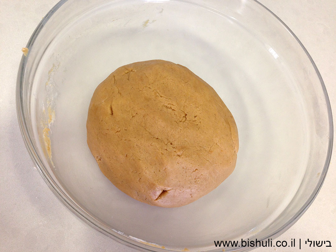 - עוטפים את כדור הבצק בניילון נצמד ומעבירים למקרר למשך כשעתיים כדי שהבצק יתקרר. (בשלב זה ניתן להקפיא את הבצק ולהפשיר במקרר בעת הצורך.
